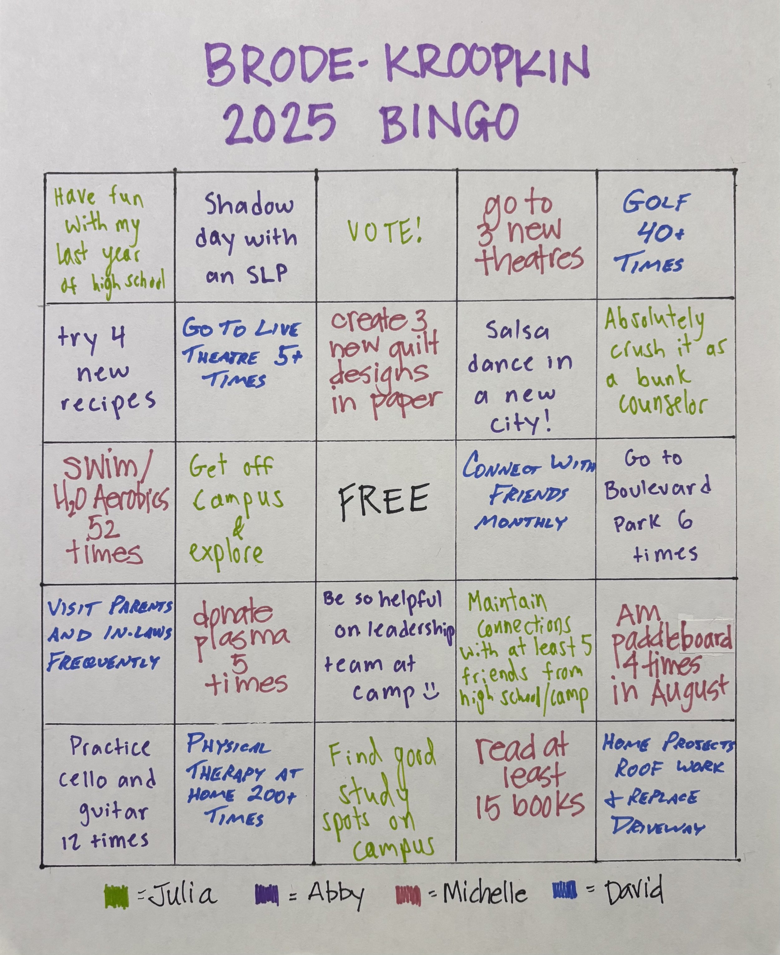 2025 has included both change and stability for me. I decided not to return to the Jewish Day School after five years on staff, and have felt good about that transition. David and I now have the house to ourselves. Though I miss the girls’ presence, I am enjoying the ways that parenting shifts as Abby and Julia take these next steps in life, and I enjoy the new routines David and I are creating. After years of knee challenges, including spending the summer on crutches with a torn right meniscus, I decided to have knee replacement surgery on my right knee. I have been very fortunate to have a smooth recovery. In addition to that, I’ve taken awesome classes on How Narrative Shapes Growth, Health, and Resilience, and on Cultivating the Compassionate Heart. Very encouraging to be part of a class full of people focusing on compassion. I’m exploring ideas about where to place my time and energy- and am excited to see how things unfold in the next few months. The 2025 bingo card has provided me focus throughout the year- some goals I stretched to achieve because they were on my card- others were ideas that spoke to me at the beginning of January that didn’t speak to me as the year progressed. I’m looking forward to building next year’s card soon!
